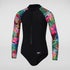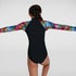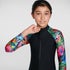 Stylish swimwear for swim, surf and SUP. Walk on the wild side wearing the stunning Long Sleeve Swimsuit, featuring a sleek black design with on-trend animal print sleeves. Made for junior beach adventures, the all-in-one suit includes a front zip opening and is front lined for your child's comfort and modesty. Offering full coverage across the chest, back and arms, it’s great for fun days on and off the board. The EnduraBrite fabric offers superb colour performance, so you can enjoy the vibrant animal print for longer. Offering higher chlorine resistance than standard swimwear fabrics, it fits like new for longer with CREORA® HighClo™ and is made from 100% recycled yarns.