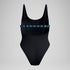 Rock our black scoop-neck swimsuit on the sun lounger, or wear it bodysuit-style to a sunset soiree. Iridescent Speedo Boom elastic elevates the simple silhouette to must-pack status. A high-cut leg and cheeky coverage keep it modern, while UPF50+ blocks the burn. Cut from quick-drying, chlorine-resistant fabric.