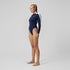 Old-school styling, fresh new vibe. Our navy long-sleeve swimsuit puts a fresh spin on retro sports styling with its front zip and modern cut-out back. Comfy, chlorine-resistant fabric feels as good as it looks, so you can style it up for the beach or street. Keep your cool in the quick-drying fabric with UPF50+ sun protection.