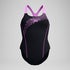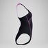 Fitness goals? Go get them in our black Medley Medalist swimsuit. Stay agile and comfortable in the classic medalist design, which aids shoulder movement and flexibility. Look sharp in the violet plastisol print with matching colour-pop straps. Cut from pilling-resistant Enduraflex fabric for better shape retention and higher chlorine resistance.